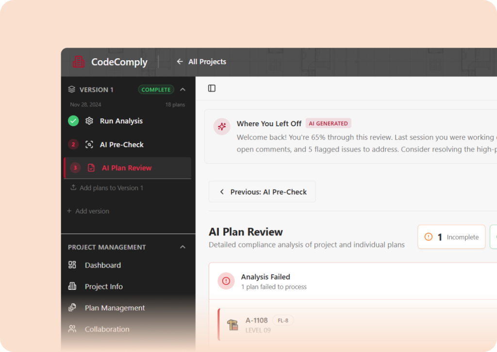 “CodeComply caught issues our team would have missed until the third review cycle. We shaved weeks off permitting and avoided a costly redesign.”